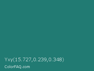 Yxy 15.727,0.239,0.348 Color is a normal cyan color and the nearest color is Elm #1c7c7d. Hex code #217b73 and RGB value is rgb(33,123,115). In RGB color space, this color is composed of 13% red, 48% green, 45% blue, In CMYK color space, this color is composed of 73% cyan, 0% magenta, 7% yellow , 52% black , In HSL color space, this color has a hue angle of 175° , 58% saturation and 31% lightness.