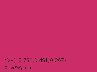 Yxy 15.734,0.481,0.267 Color is a normal rose color and the nearest color is Telemagenta #cf3476. Hex code #cc2d69 and RGB value is rgb(204,45,105). In RGB color space, this color is composed of 80% red, 18% green, 41% blue, In CMYK color space, this color is composed of 0% cyan, 78% magenta, 49% yellow , 20% black , In HSL color space, this color has a hue angle of 337° , 64% saturation and 49% lightness.