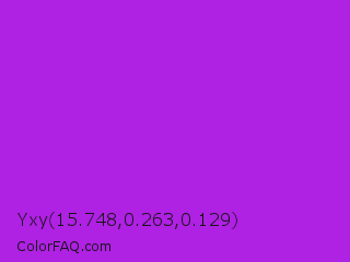 Yxy 15.748,0.263,0.129 Color is a normal purple color and the nearest color is Veronica #a020f0. Hex code #af21e3 and RGB value is rgb(175,33,227). In RGB color space, this color is composed of 69% red, 13% green, 89% blue, In CMYK color space, this color is composed of 23% cyan, 85% magenta, 0% yellow , 11% black , In HSL color space, this color has a hue angle of 284° , 78% saturation and 51% lightness.