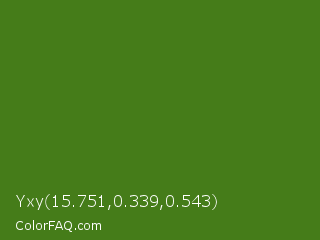 Yxy 15.751,0.339,0.543 Color is a dark green color and the nearest color is La Palma #368716. Hex code #457c19 and RGB value is rgb(69,124,25). In RGB color space, this color is composed of 27% red, 49% green, 10% blue, In CMYK color space, this color is composed of 44% cyan, 0% magenta, 80% yellow , 51% black , In HSL color space, this color has a hue angle of 93° , 66% saturation and 29% lightness.
