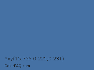 Yxy 15.756,0.221,0.231 Color is a normal blue color and the nearest color is San Marino #456cac. Hex code #4571a4 and RGB value is rgb(69,113,164). In RGB color space, this color is composed of 27% red, 44% green, 64% blue, In CMYK color space, this color is composed of 58% cyan, 31% magenta, 0% yellow , 36% black , In HSL color space, this color has a hue angle of 212° , 41% saturation and 46% lightness.