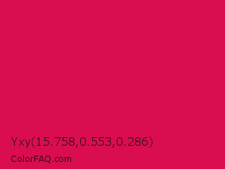Yxy 15.758,0.553,0.286 Color is a normal rose color and the nearest color is Debian Red #d70a53. Hex code #da0d4f and RGB value is rgb(218,13,79). In RGB color space, this color is composed of 85% red, 5% green, 31% blue, In CMYK color space, this color is composed of 0% cyan, 94% magenta, 64% yellow , 15% black , In HSL color space, this color has a hue angle of 341° , 89% saturation and 45% lightness.