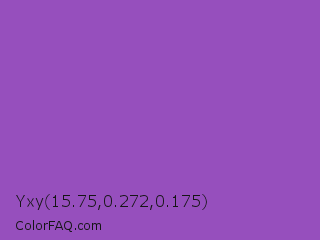 Yxy 15.75,0.272,0.175 Color is a normal purple color and the nearest color is Deep Lilac #9955bb. Hex code #964fbd and RGB value is rgb(150,79,189). In RGB color space, this color is composed of 59% red, 31% green, 74% blue, In CMYK color space, this color is composed of 21% cyan, 58% magenta, 0% yellow , 26% black , In HSL color space, this color has a hue angle of 279° , 45% saturation and 53% lightness.