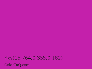 Yxy 15.764,0.355,0.182 Color is a normal magenta color and the nearest color is Byzantine #bd33a4. Hex code #c420ab and RGB value is rgb(196,32,171). In RGB color space, this color is composed of 77% red, 13% green, 67% blue, In CMYK color space, this color is composed of 0% cyan, 84% magenta, 13% yellow , 23% black , In HSL color space, this color has a hue angle of 309° , 72% saturation and 45% lightness.