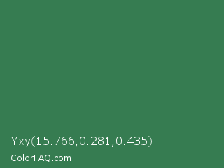 Yxy 15.766,0.281,0.435 Color is a normal green color and the nearest color is Goblin #3d7d52. Hex code #367c51 and RGB value is rgb(54,124,81). In RGB color space, this color is composed of 21% red, 49% green, 32% blue, In CMYK color space, this color is composed of 56% cyan, 0% magenta, 35% yellow , 51% black , In HSL color space, this color has a hue angle of 143° , 39% saturation and 35% lightness.