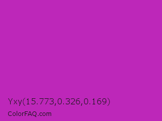 Yxy 15.773,0.326,0.169 Color is a normal magenta color and the nearest color is Byzantine #bd33a4. Hex code #bd27b9 and RGB value is rgb(189,39,185). In RGB color space, this color is composed of 74% red, 15% green, 73% blue, In CMYK color space, this color is composed of 0% cyan, 79% magenta, 2% yellow , 26% black , In HSL color space, this color has a hue angle of 302° , 66% saturation and 45% lightness.