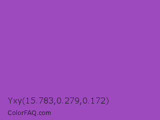 Yxy 15.783,0.279,0.172 Color is a normal purple color and the nearest color is Purple Plum #9c51b6. Hex code #9d4abe and RGB value is rgb(157,74,190). In RGB color space, this color is composed of 62% red, 29% green, 75% blue, In CMYK color space, this color is composed of 17% cyan, 61% magenta, 0% yellow , 25% black , In HSL color space, this color has a hue angle of 283° , 47% saturation and 52% lightness.