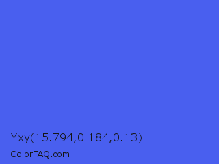 Yxy 15.794,0.184,0.13 Color is a light blue color and the nearest color is Ultramarine Blue #4166f5. Hex code #495fef and RGB value is rgb(73,95,239). In RGB color space, this color is composed of 29% red, 37% green, 94% blue, In CMYK color space, this color is composed of 69% cyan, 60% magenta, 0% yellow , 6% black , In HSL color space, this color has a hue angle of 232° , 84% saturation and 61% lightness.