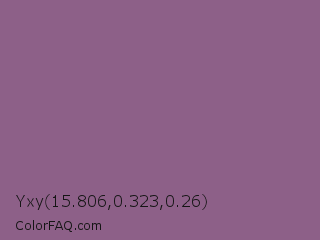 Yxy 15.806,0.323,0.26 Color is a normal magenta color and the nearest color is Antique Fuchsia #915c83. Hex code #8d6088 and RGB value is rgb(141,96,136). In RGB color space, this color is composed of 55% red, 38% green, 53% blue, In CMYK color space, this color is composed of 0% cyan, 32% magenta, 4% yellow , 45% black , In HSL color space, this color has a hue angle of 307° , 19% saturation and 46% lightness.