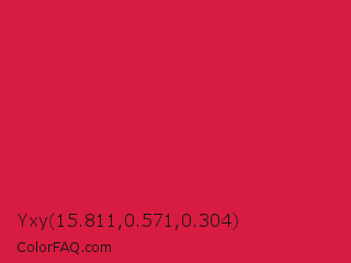 Yxy 15.811,0.571,0.304 Color is a normal red color and the nearest color is Crimson #dc143c. Hex code #d81c41 and RGB value is rgb(216,28,65). In RGB color space, this color is composed of 85% red, 11% green, 25% blue, In CMYK color space, this color is composed of 0% cyan, 87% magenta, 70% yellow , 15% black , In HSL color space, this color has a hue angle of 348° , 77% saturation and 48% lightness.
