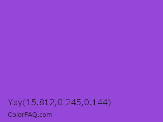 Yxy 15.812,0.245,0.144 Color is a normal purple color and the nearest color is Navy Purple #9457eb. Hex code #9447d9 and RGB value is rgb(148,71,217). In RGB color space, this color is composed of 58% red, 28% green, 85% blue, In CMYK color space, this color is composed of 32% cyan, 67% magenta, 0% yellow , 15% black , In HSL color space, this color has a hue angle of 272° , 66% saturation and 56% lightness.
