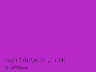 Yxy 15.812,0.301,0.154 Color is a normal magenta color and the nearest color is Steel Pink #cc33cc. Hex code #b827c8 and RGB value is rgb(184,39,200). In RGB color space, this color is composed of 72% red, 15% green, 78% blue, In CMYK color space, this color is composed of 8% cyan, 81% magenta, 0% yellow , 22% black , In HSL color space, this color has a hue angle of 294° , 67% saturation and 47% lightness.