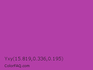 Yxy 15.819,0.336,0.195 Color is a normal magenta color and the nearest color is Byzantine #bd33a4. Hex code #b33ea7 and RGB value is rgb(179,62,167). In RGB color space, this color is composed of 70% red, 24% green, 65% blue, In CMYK color space, this color is composed of 0% cyan, 65% magenta, 7% yellow , 30% black , In HSL color space, this color has a hue angle of 306° , 49% saturation and 47% lightness.