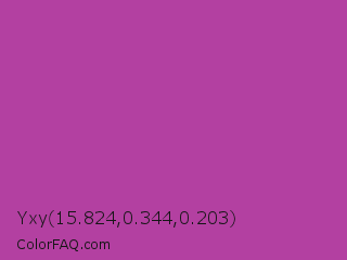 Yxy 15.824,0.344,0.203 Color is a normal magenta color and the nearest color is Byzantine #bd33a4. Hex code #b340a1 and RGB value is rgb(179,64,161). In RGB color space, this color is composed of 70% red, 25% green, 63% blue, In CMYK color space, this color is composed of 0% cyan, 64% magenta, 10% yellow , 30% black , In HSL color space, this color has a hue angle of 309° , 47% saturation and 48% lightness.