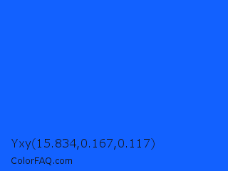 Yxy 15.834,0.167,0.117 Color is a normal blue color and the nearest color is Blue Ribbon #0066ff. Hex code #1261ff and RGB value is rgb(18,97,255). In RGB color space, this color is composed of 7% red, 38% green, 100% blue, In CMYK color space, this color is composed of 93% cyan, 62% magenta, 0% yellow , 0% black , In HSL color space, this color has a hue angle of 220° , 100% saturation and 54% lightness.