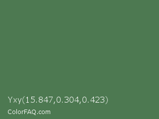Yxy 15.847,0.304,0.423 Color is a normal green color and the nearest color is Hippie Green #53824b. Hex code #4d7951 and RGB value is rgb(77,121,81). In RGB color space, this color is composed of 30% red, 47% green, 32% blue, In CMYK color space, this color is composed of 36% cyan, 0% magenta, 33% yellow , 53% black , In HSL color space, this color has a hue angle of 125° , 22% saturation and 39% lightness.
