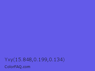 Yxy 15.848,0.199,0.134 Color is a light indigo color and the nearest color is Majorelle Blue #6050dc. Hex code #635ae9 and RGB value is rgb(99,90,233). In RGB color space, this color is composed of 39% red, 35% green, 91% blue, In CMYK color space, this color is composed of 58% cyan, 61% magenta, 0% yellow , 9% black , In HSL color space, this color has a hue angle of 244° , 76% saturation and 63% lightness.