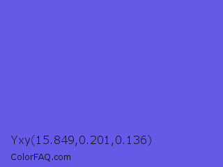 Yxy 15.849,0.201,0.136 Color is a light indigo color and the nearest color is Majorelle Blue #6050dc. Hex code #655ae7 and RGB value is rgb(101,90,231). In RGB color space, this color is composed of 40% red, 35% green, 91% blue, In CMYK color space, this color is composed of 56% cyan, 61% magenta, 0% yellow , 9% black , In HSL color space, this color has a hue angle of 245° , 75% saturation and 63% lightness.