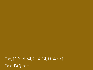 Yxy 15.854,0.474,0.455 Color is a dark orange color and the nearest color is Corn Harvest #8b6b0b. Hex code #90680a and RGB value is rgb(144,104,10). In RGB color space, this color is composed of 56% red, 41% green, 4% blue, In CMYK color space, this color is composed of 0% cyan, 28% magenta, 93% yellow , 44% black , In HSL color space, this color has a hue angle of 42° , 87% saturation and 30% lightness.