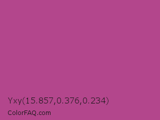 Yxy 15.857,0.376,0.234 Color is a normal magenta color and the nearest color is Mulberry #c54b8c. Hex code #b3468c and RGB value is rgb(179,70,140). In RGB color space, this color is composed of 70% red, 27% green, 55% blue, In CMYK color space, this color is composed of 0% cyan, 61% magenta, 22% yellow , 30% black , In HSL color space, this color has a hue angle of 321° , 44% saturation and 49% lightness.