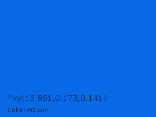 Yxy 15.861,0.173,0.141 Color is a normal blue color and the nearest color is True Blue #0073cf. Hex code #0769e6 and RGB value is rgb(7,105,230). In RGB color space, this color is composed of 3% red, 41% green, 90% blue, In CMYK color space, this color is composed of 97% cyan, 54% magenta, 0% yellow , 10% black , In HSL color space, this color has a hue angle of 214° , 94% saturation and 46% lightness.
