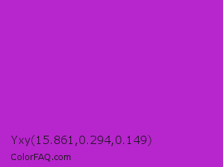 Yxy 15.861,0.294,0.149 Color is a normal magenta color and the nearest color is Steel Pink #cc33cc. Hex code #b725cd and RGB value is rgb(183,37,205). In RGB color space, this color is composed of 72% red, 15% green, 80% blue, In CMYK color space, this color is composed of 11% cyan, 82% magenta, 0% yellow , 20% black , In HSL color space, this color has a hue angle of 292° , 69% saturation and 47% lightness.