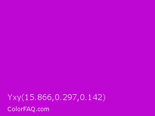 Yxy 15.866,0.297,0.142 Color is a normal magenta color and the nearest color is Deep Magenta #cc00cc. Hex code #bf07d3 and RGB value is rgb(191,7,211). In RGB color space, this color is composed of 75% red, 3% green, 83% blue, In CMYK color space, this color is composed of 9% cyan, 97% magenta, 0% yellow , 17% black , In HSL color space, this color has a hue angle of 294° , 94% saturation and 43% lightness.