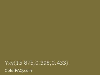Yxy 15.875,0.398,0.433 Color is a normal yellow color and the nearest color is Spanish Bistre #807532. Hex code #7b6f39 and RGB value is rgb(123,111,57). In RGB color space, this color is composed of 48% red, 44% green, 22% blue, In CMYK color space, this color is composed of 0% cyan, 10% magenta, 54% yellow , 52% black , In HSL color space, this color has a hue angle of 49° , 37% saturation and 35% lightness.