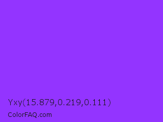 Yxy 15.879,0.219,0.111 Color is a normal violet color and the nearest color is Veronica #a020f0. Hex code #9334ff and RGB value is rgb(147,52,255). In RGB color space, this color is composed of 58% red, 20% green, 100% blue, In CMYK color space, this color is composed of 42% cyan, 80% magenta, 0% yellow , 0% black , In HSL color space, this color has a hue angle of 268° , 100% saturation and 60% lightness.