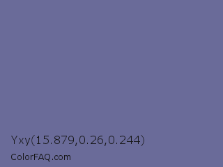Yxy 15.879,0.26,0.244 Color is a normal blue color and the nearest color is Dark Blue Gray #666699. Hex code #6a6b99 and RGB value is rgb(106,107,153). In RGB color space, this color is composed of 42% red, 42% green, 60% blue, In CMYK color space, this color is composed of 31% cyan, 30% magenta, 0% yellow , 40% black , In HSL color space, this color has a hue angle of 239° , 19% saturation and 51% lightness.