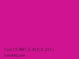 Yxy 15.887,0.415,0.211 Color is a normal magenta color and the nearest color is Red Violet #c71585. Hex code #d01491 and RGB value is rgb(208,20,145). In RGB color space, this color is composed of 82% red, 8% green, 57% blue, In CMYK color space, this color is composed of 0% cyan, 90% magenta, 30% yellow , 18% black , In HSL color space, this color has a hue angle of 320° , 82% saturation and 45% lightness.