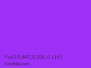 Yxy 15.897,0.231,0.116 Color is a normal purple color and the nearest color is Veronica #a020f0. Hex code #9d2ff7 and RGB value is rgb(157,47,247). In RGB color space, this color is composed of 62% red, 18% green, 97% blue, In CMYK color space, this color is composed of 36% cyan, 81% magenta, 0% yellow , 3% black , In HSL color space, this color has a hue angle of 273° , 93% saturation and 58% lightness.