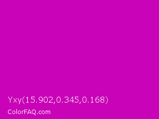 Yxy 15.902,0.345,0.168 Color is a normal magenta color and the nearest color is Deep Magenta #cc00cc. Hex code #c903b7 and RGB value is rgb(201,3,183). In RGB color space, this color is composed of 79% red, 1% green, 72% blue, In CMYK color space, this color is composed of 0% cyan, 99% magenta, 9% yellow , 21% black , In HSL color space, this color has a hue angle of 305° , 97% saturation and 40% lightness.