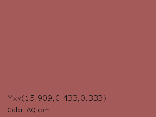 Yxy 15.909,0.433,0.333 Color is a normal red color and the nearest color is Redwood #a45a52. Hex code #a45a58 and RGB value is rgb(164,90,88). In RGB color space, this color is composed of 64% red, 35% green, 35% blue, In CMYK color space, this color is composed of 0% cyan, 45% magenta, 46% yellow , 36% black , In HSL color space, this color has a hue angle of 2° , 30% saturation and 49% lightness.