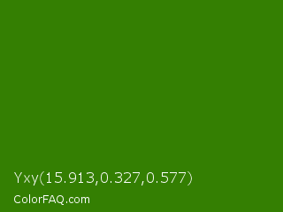 Yxy 15.913,0.327,0.577 Color is a dark green color and the nearest color is Napier Green #2a8000. Hex code #347f02 and RGB value is rgb(52,127,2). In RGB color space, this color is composed of 20% red, 50% green, 1% blue, In CMYK color space, this color is composed of 59% cyan, 0% magenta, 98% yellow , 50% black , In HSL color space, this color has a hue angle of 96° , 97% saturation and 25% lightness.
