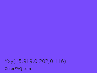 Yxy 15.919,0.202,0.116 Color is a light indigo color and the nearest color is Medium Slate Blue #7b68ee. Hex code #784afc and RGB value is rgb(120,74,252). In RGB color space, this color is composed of 47% red, 29% green, 99% blue, In CMYK color space, this color is composed of 52% cyan, 71% magenta, 0% yellow , 1% black , In HSL color space, this color has a hue angle of 256° , 97% saturation and 64% lightness.
