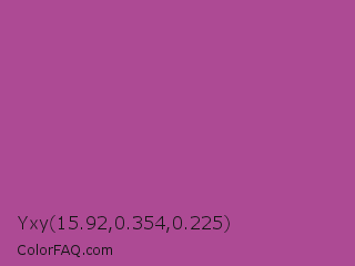 Yxy 15.92,0.354,0.225 Color is a normal magenta color and the nearest color is Mulberry #c54b8c. Hex code #ad4a94 and RGB value is rgb(173,74,148). In RGB color space, this color is composed of 68% red, 29% green, 58% blue, In CMYK color space, this color is composed of 0% cyan, 57% magenta, 14% yellow , 32% black , In HSL color space, this color has a hue angle of 315° , 40% saturation and 48% lightness.