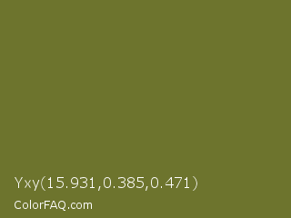 Yxy 15.931,0.385,0.471 Color is a normal yellow color and the nearest color is Crete #737829. Hex code #6d742d and RGB value is rgb(109,116,45). In RGB color space, this color is composed of 43% red, 45% green, 18% blue, In CMYK color space, this color is composed of 6% cyan, 0% magenta, 61% yellow , 55% black , In HSL color space, this color has a hue angle of 66° , 44% saturation and 32% lightness.