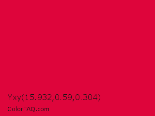 Yxy 15.932,0.59,0.304 Color is a normal red color and the nearest color is Rich Carmine #d70040. Hex code #de053b and RGB value is rgb(222,5,59). In RGB color space, this color is composed of 87% red, 2% green, 23% blue, In CMYK color space, this color is composed of 0% cyan, 98% magenta, 73% yellow , 13% black , In HSL color space, this color has a hue angle of 345° , 96% saturation and 45% lightness.