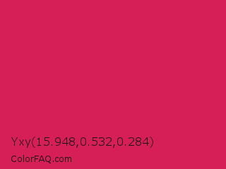 Yxy 15.948,0.532,0.284 Color is a normal rose color and the nearest color is Spanish Crimson #e51a4c. Hex code #d61f56 and RGB value is rgb(214,31,86). In RGB color space, this color is composed of 84% red, 12% green, 34% blue, In CMYK color space, this color is composed of 0% cyan, 86% magenta, 60% yellow , 16% black , In HSL color space, this color has a hue angle of 342° , 75% saturation and 48% lightness.