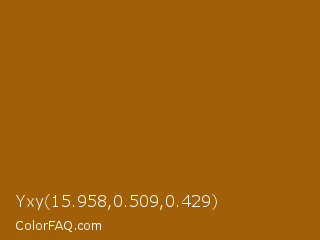 Yxy 15.958,0.509,0.429 Color is a normal orange color and the nearest color is Gamboge Orange Brown #996600. Hex code #a16008 and RGB value is rgb(161,96,8). In RGB color space, this color is composed of 63% red, 38% green, 3% blue, In CMYK color space, this color is composed of 0% cyan, 40% magenta, 95% yellow , 37% black , In HSL color space, this color has a hue angle of 35° , 91% saturation and 33% lightness.