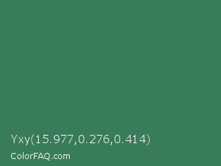 Yxy 15.977,0.276,0.414 Color is a normal green color and the nearest color is Amazon #3b7a57. Hex code #387c59 and RGB value is rgb(56,124,89). In RGB color space, this color is composed of 22% red, 49% green, 35% blue, In CMYK color space, this color is composed of 55% cyan, 0% magenta, 28% yellow , 51% black , In HSL color space, this color has a hue angle of 149° , 38% saturation and 35% lightness.