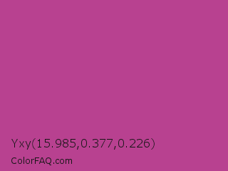 Yxy 15.985,0.377,0.226 Color is a normal magenta color and the nearest color is Fandango #b53389. Hex code #b84190 and RGB value is rgb(184,65,144). In RGB color space, this color is composed of 72% red, 25% green, 56% blue, In CMYK color space, this color is composed of 0% cyan, 65% magenta, 22% yellow , 28% black , In HSL color space, this color has a hue angle of 320° , 48% saturation and 49% lightness.