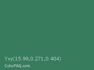 Yxy 15.99,0.271,0.404 Color is a normal green color and the nearest color is Amazon #3b7a57. Hex code #377c5d and RGB value is rgb(55,124,93). In RGB color space, this color is composed of 22% red, 49% green, 36% blue, In CMYK color space, this color is composed of 56% cyan, 0% magenta, 25% yellow , 51% black , In HSL color space, this color has a hue angle of 153° , 39% saturation and 35% lightness.