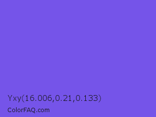Yxy 16.006,0.21,0.133 Color is a light indigo color and the nearest color is Medium Slate Blue #7b68ee. Hex code #7554e9 and RGB value is rgb(117,84,233). In RGB color space, this color is composed of 46% red, 33% green, 91% blue, In CMYK color space, this color is composed of 50% cyan, 64% magenta, 0% yellow , 9% black , In HSL color space, this color has a hue angle of 253° , 77% saturation and 62% lightness.