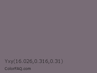 Yxy 16.026,0.316,0.31 Color is a normal magenta color and the nearest color is Fedora #796a78. Hex code #786c76 and RGB value is rgb(120,108,118). In RGB color space, this color is composed of 47% red, 42% green, 46% blue, In CMYK color space, this color is composed of 0% cyan, 10% magenta, 2% yellow , 53% black , In HSL color space, this color has a hue angle of 310° , 5% saturation and 45% lightness.