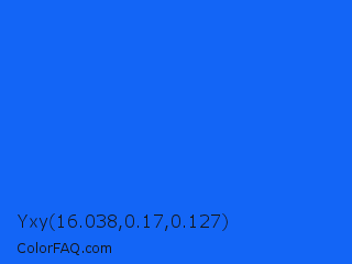 Yxy 16.038,0.17,0.127 Color is a normal blue color and the nearest color is Blue Ribbon #0066ff. Hex code #1365f6 and RGB value is rgb(19,101,246). In RGB color space, this color is composed of 7% red, 40% green, 96% blue, In CMYK color space, this color is composed of 92% cyan, 59% magenta, 0% yellow , 4% black , In HSL color space, this color has a hue angle of 218° , 93% saturation and 52% lightness.