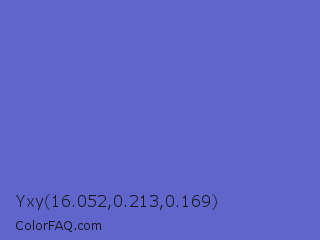 Yxy 16.052,0.213,0.169 Color is a normal blue color and the nearest color is Slate Blue #6a5acd. Hex code #6065cb and RGB value is rgb(96,101,203). In RGB color space, this color is composed of 38% red, 40% green, 80% blue, In CMYK color space, this color is composed of 53% cyan, 50% magenta, 0% yellow , 20% black , In HSL color space, this color has a hue angle of 237° , 51% saturation and 59% lightness.