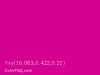 Yxy 16.063,0.422,0.21 Color is a normal magenta color and the nearest color is Mexican Pink #e4007c. Hex code #d40191 and RGB value is rgb(212,1,145). In RGB color space, this color is composed of 83% red, 0% green, 57% blue, In CMYK color space, this color is composed of 0% cyan, 100% magenta, 32% yellow , 17% black , In HSL color space, this color has a hue angle of 319° , 99% saturation and 42% lightness.