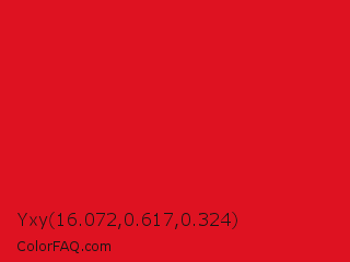 Yxy 16.072,0.617,0.324 Color is a normal red color and the nearest color is Lava #cf1020. Hex code #de1221 and RGB value is rgb(222,18,33). In RGB color space, this color is composed of 87% red, 7% green, 13% blue, In CMYK color space, this color is composed of 0% cyan, 92% magenta, 85% yellow , 13% black , In HSL color space, this color has a hue angle of 356° , 85% saturation and 47% lightness.